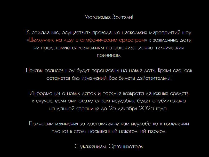 «Уважаемые зрители! К сожалению, осуществить проведение нескольких мероприятий шоу „Щелкунчик на льду с симфоническим оркестром“ в заявленные даты не представляется возможным по организационно-техническим причинам. Показы сеансов шоу будут перенесены на новые даты. Время сеансов останется без изменений. Все билеты действительны! Информация о новых датах и порядке возврата денежных средств в случае, если они окажутся вам неудобны, будет опубликована на данной странице до 25 декабря 2025 года. Приносим извинения за доставляемые вам неудобства в изменении планов в столь насыщенный новогодний период», — говорится в сообщении.