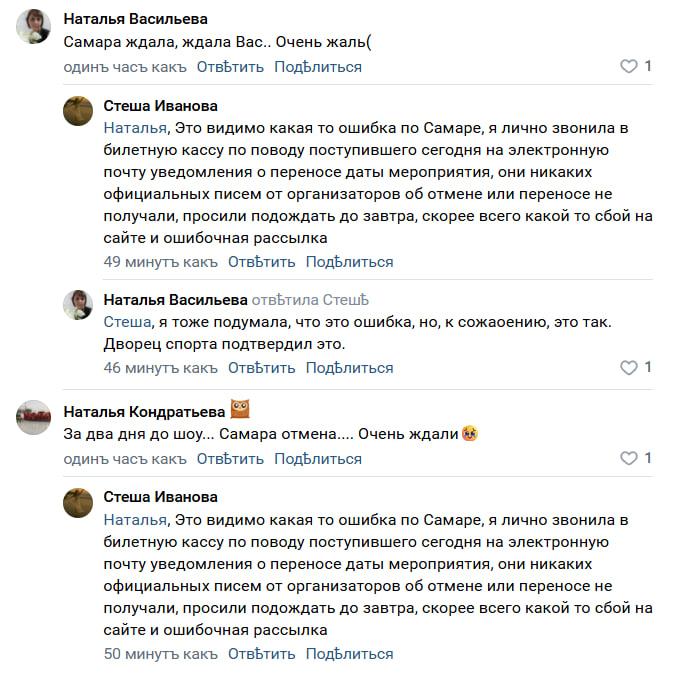 «Это видимо какая-то ошибка по Самаре, я лично звонила в билетную кассу по поводу поступившего сегодня на электронную почту уведомления о переносе даты мероприятия, они никаких официальных писем от организаторов об отмене или переносе не получали, просили подождать до завтра, скорее всего какой-то сбой на сайте и ошибочная рассылка», — утверждает местная жительница.