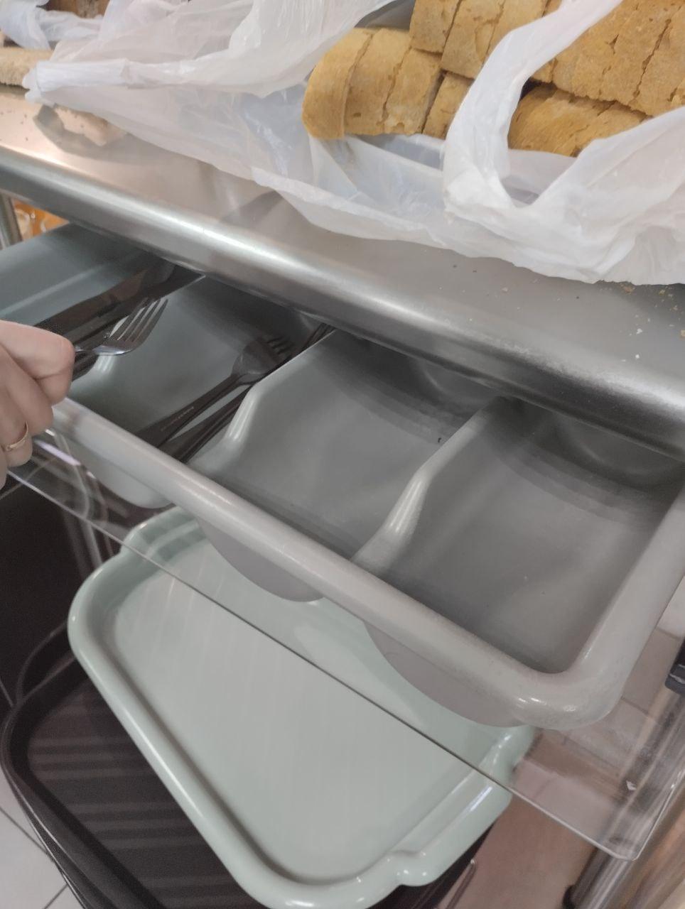 Вторая фотография демонстрирует почти пустой лоток для приборов. На снимке осталось лишь три вилки и несколько ножей, что подтверждает остроту проблемы.