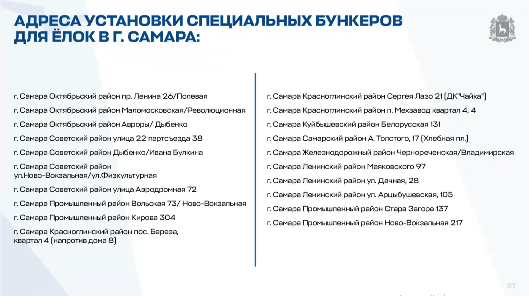 Министр природных ресурсов и экологии Самарской области Артём Ефимов сообщил: «Для недопущения навалов на контейнерных площадках в праздничный период АО „Экология“ второй год подряд организует сбор новогодних елок в специально отведенных местах».