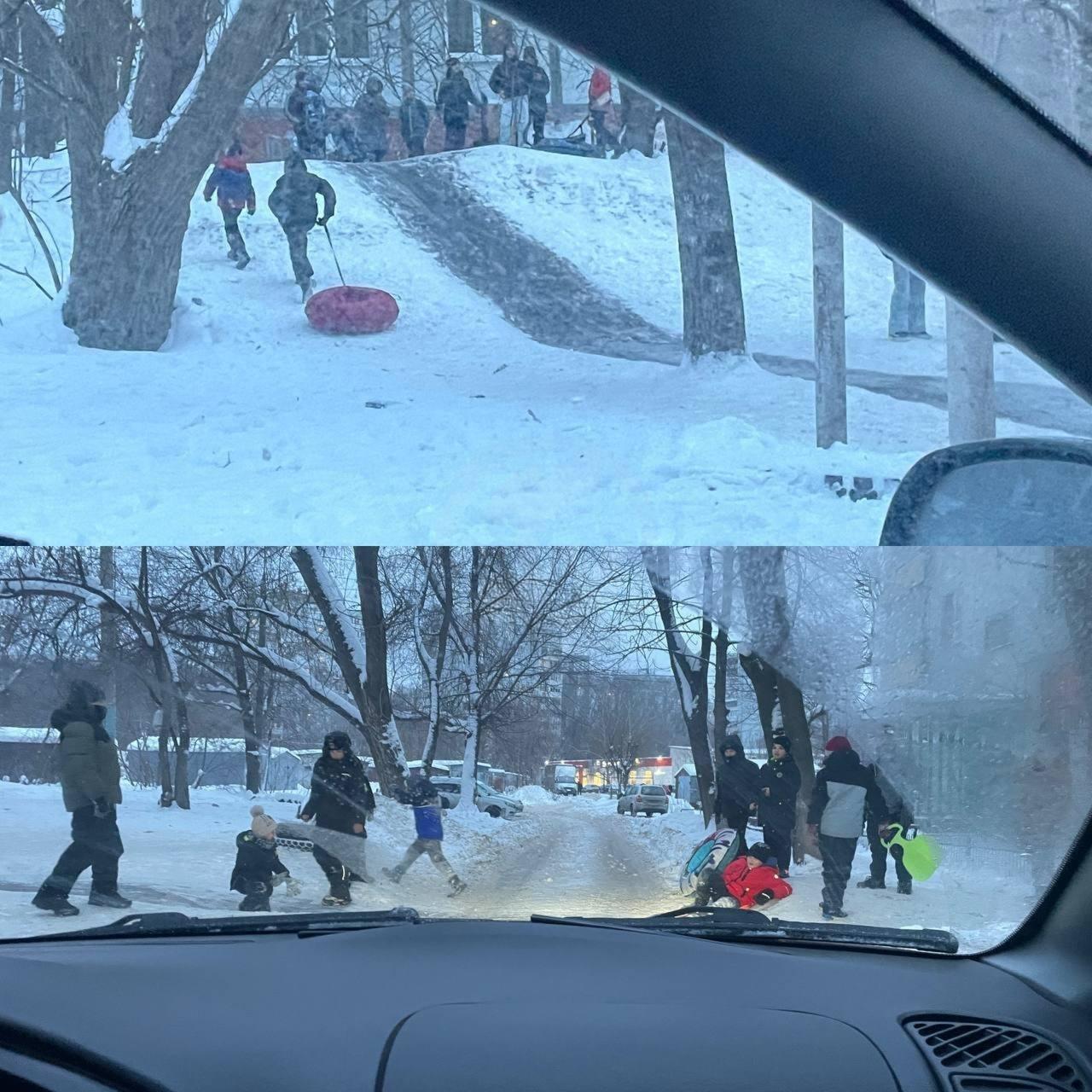 В Самаре на улице Алма-Атинской, во дворе дома №120, дети соорудили ледяную горку. Её спуск был направлен прямо на проезжую часть, где двигался транспорт. Это создавало серьёзную опасность: скатившийся ребёнок мог выкатиться под колёса автомобиля.