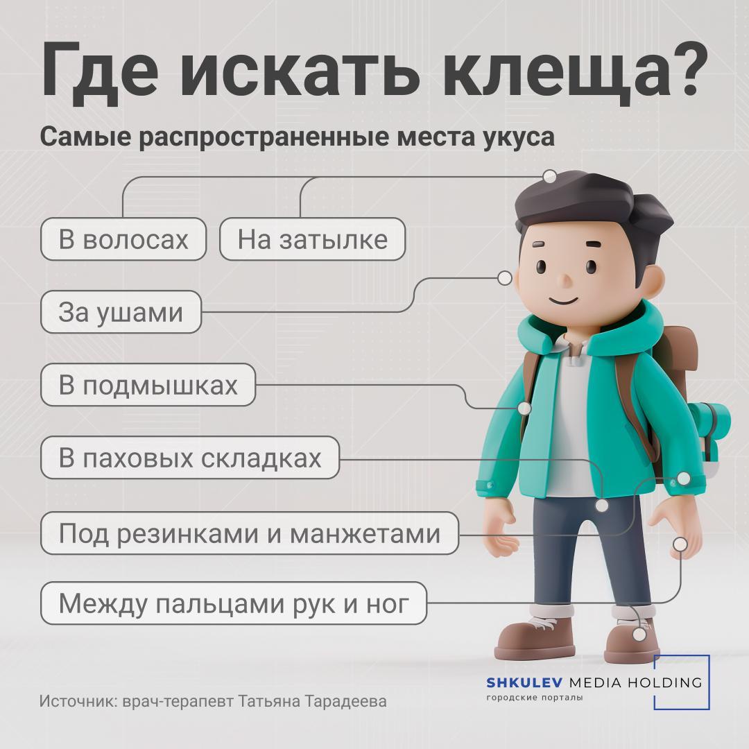 «После прогулки по лесу или выезда на природу нужно внимательно осмотреть подмышки, паховые складки, затылок, волосистую часть головы, участки за ушами, в области поясницы, между пальцами рук и ног, — советует врач-терапевт медцентра «Инвитро-Приволжье» Татьяна Тарадеева. — Не забывайте также проверить места, где одежда плотно прилегает к телу: поясницу, талию, манжеты брюк и рукава».