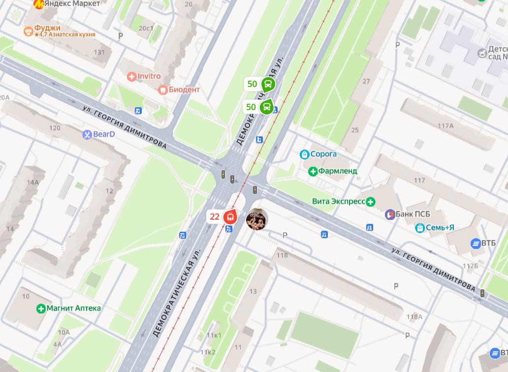 Согласно данным сервиса «Яндекс.Карты», один из трамваев уже несколько минут стоит без движения на месте происшествия.