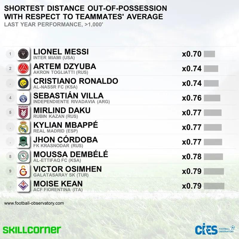 Возглавил список нападающий «Интер Майами» Лионель Месси с показателем 0,7. Это означает, что когда партнёры по команде пробегают в обороне 1 километр, аргентинец преодолевает лишь 700 метров.