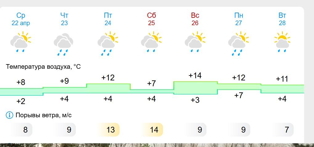 Согласно прогнозу сервиса «Гисметео», в четверг и пятницу будет облачно, пройдут дожди. Температура воздуха составит от +9 до +12 градусов. В пятницу и субботу также ожидается сильный ветер.