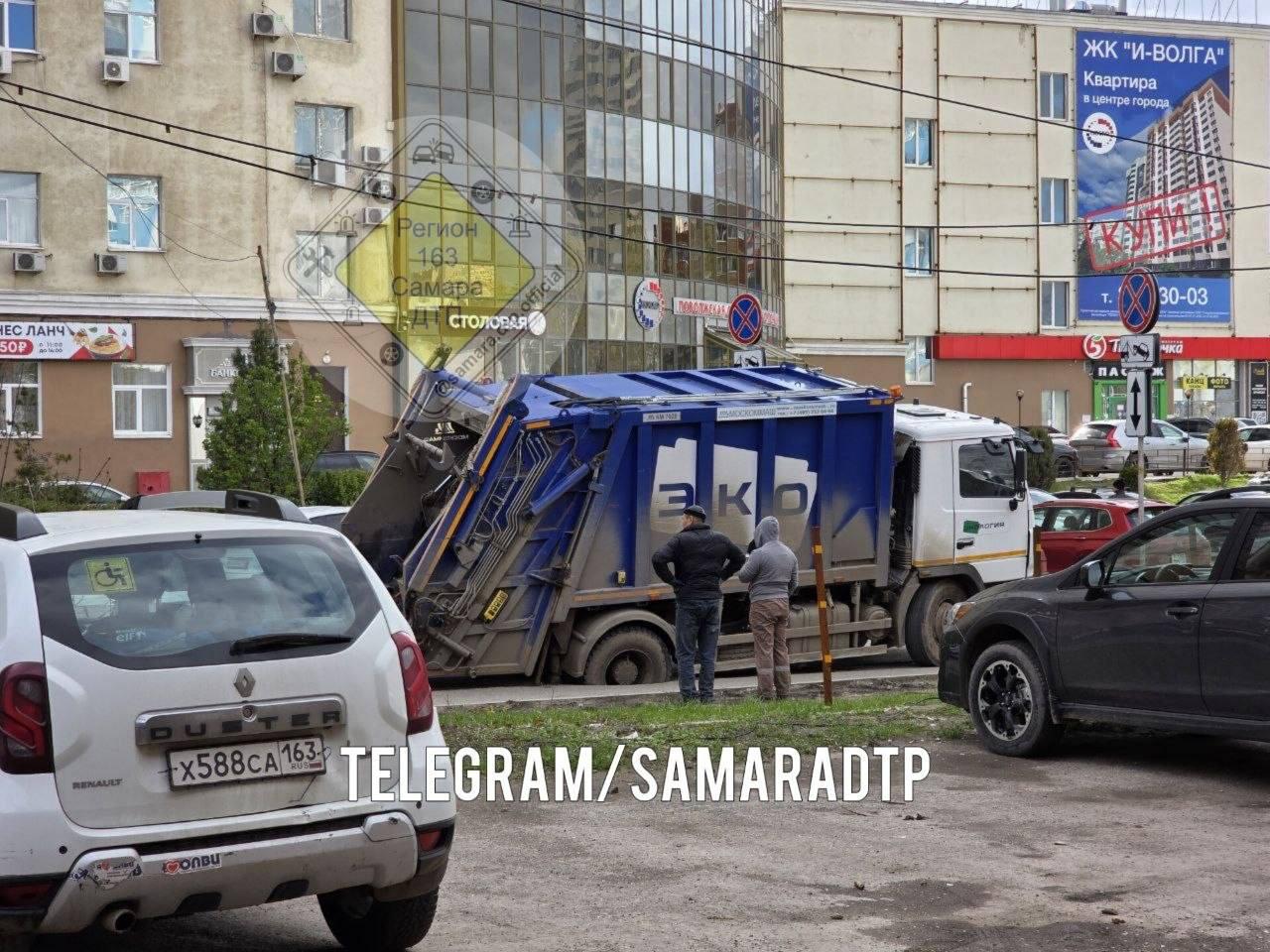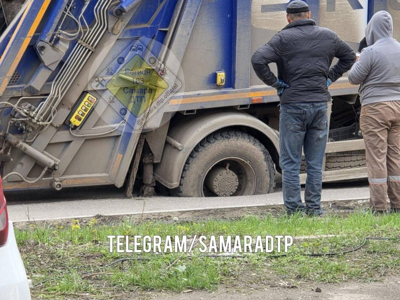 На улице Гастелло в Самаре мусоровоз провалился под дорожное покрытие, создав затор.