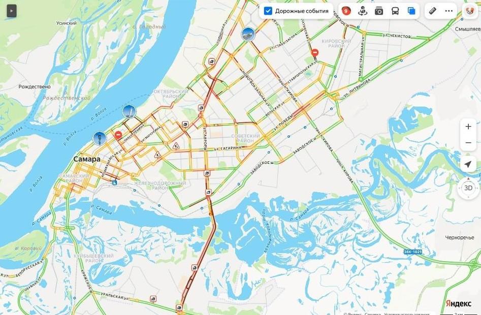 Основные проблемы возникли на главных городских магистралях. Улица Авроры полностью остановилась от Аэродромной до Уральского шоссе на другом берегу реки Самары. Не двигается и Южный мост.