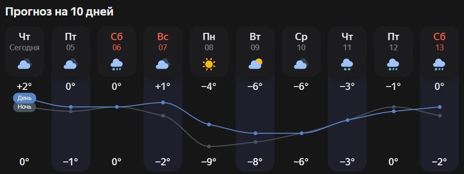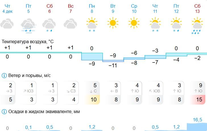 Нейросеть Яндекс.Погоды не обещает -13 °C, но сулит похолодание до -9 °C ночью. Осадки в виде снега с дождем прогнозируются в субботу, а затем до 11 декабря ожидается затишье.