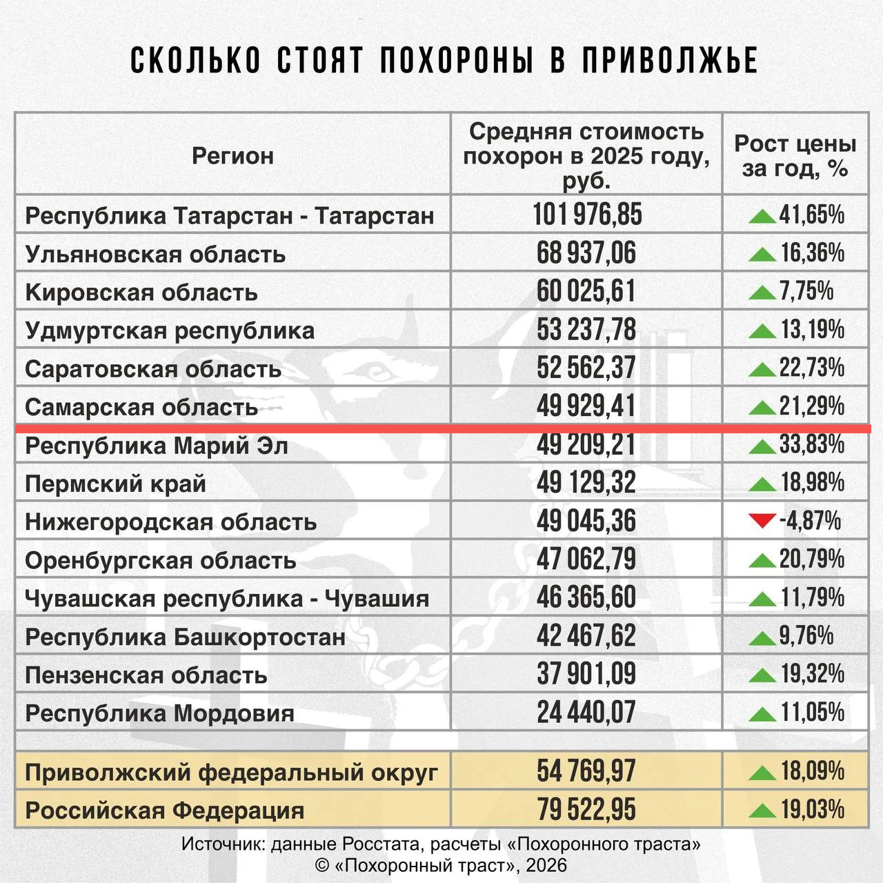 Таблица сравнения стоимости похорон в регионах Приволжского федерального округа